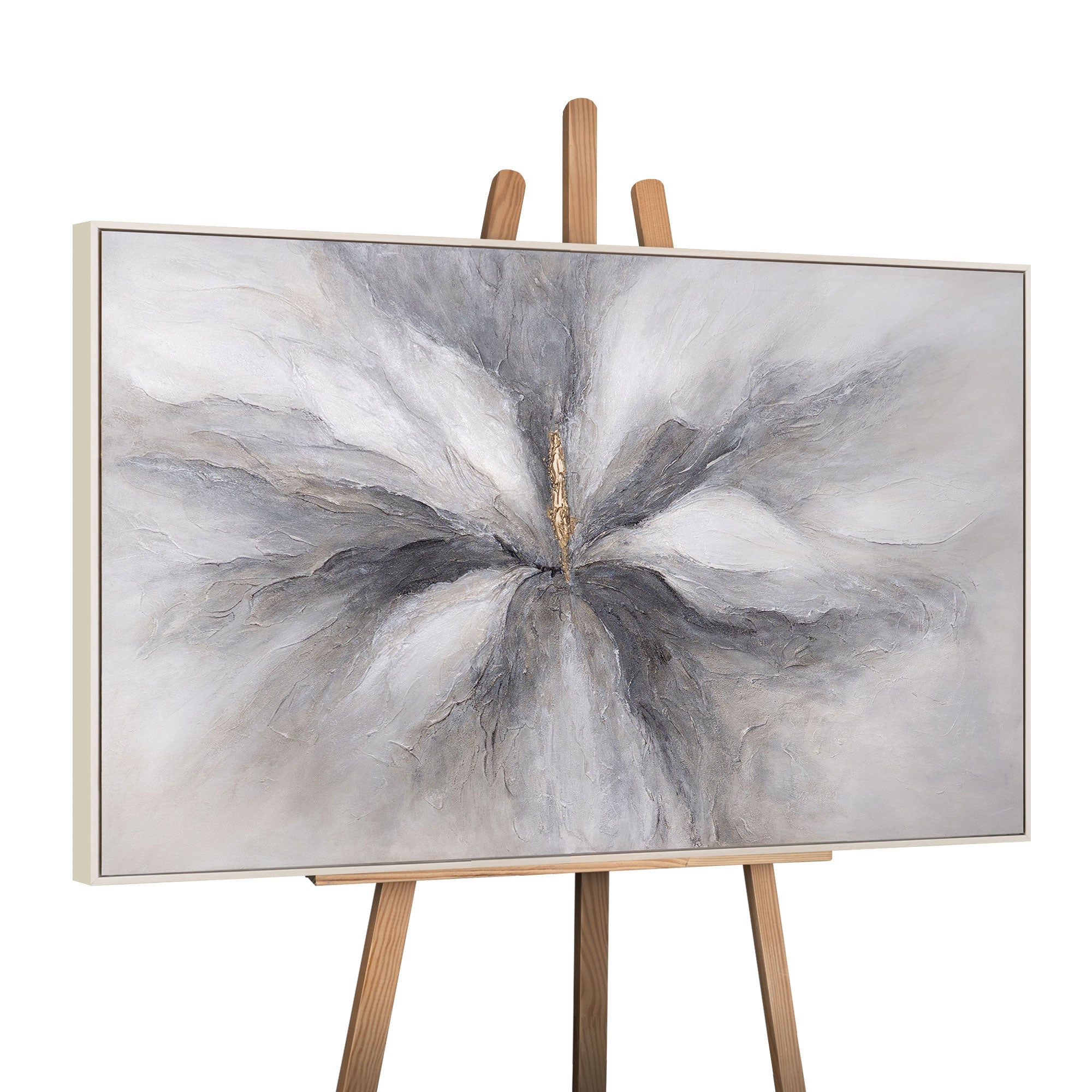 Ця картина випромінює стриману силу й елегантність. Динамічні мазки у відтінках сірого, білого та сріблястого зливаються в єдину композицію, створюючи відчуття вибуху енергії. Центральний золотий штрих підкреслює глибину полотна, додаючи йому вишуканого сяйва та акценту.