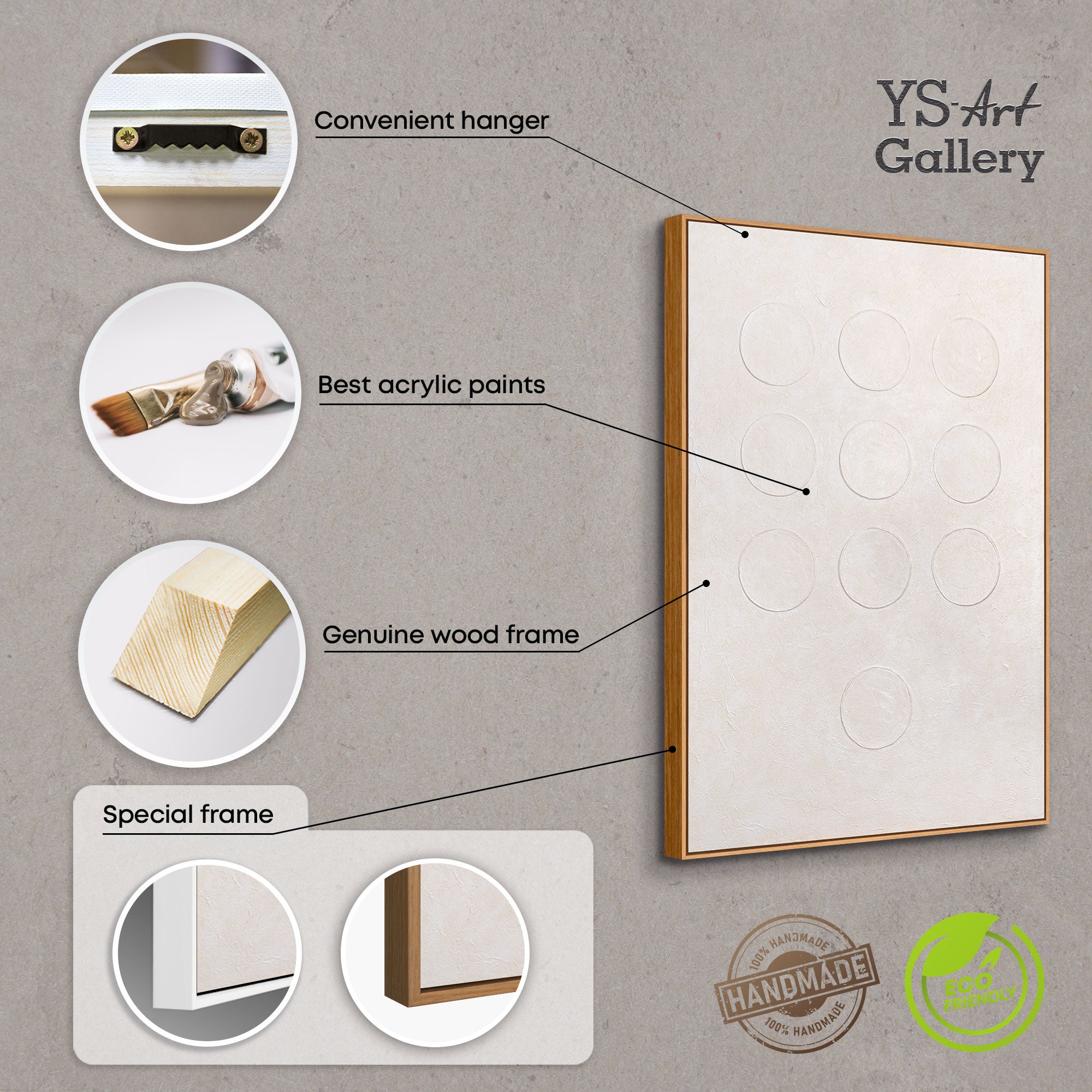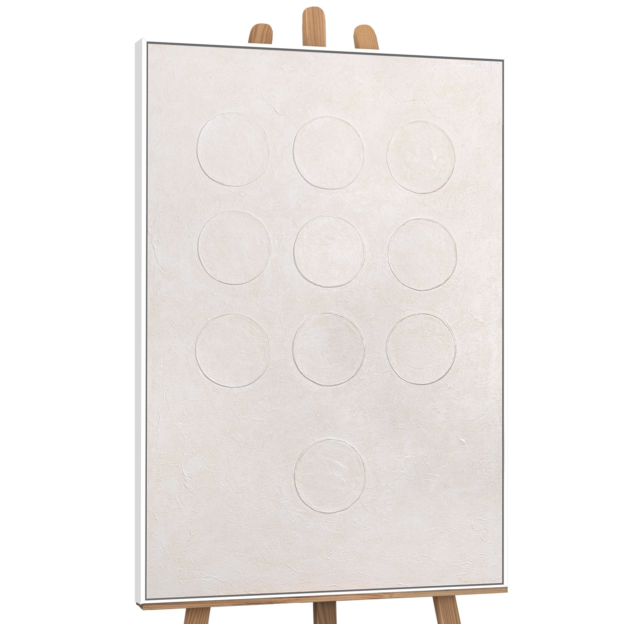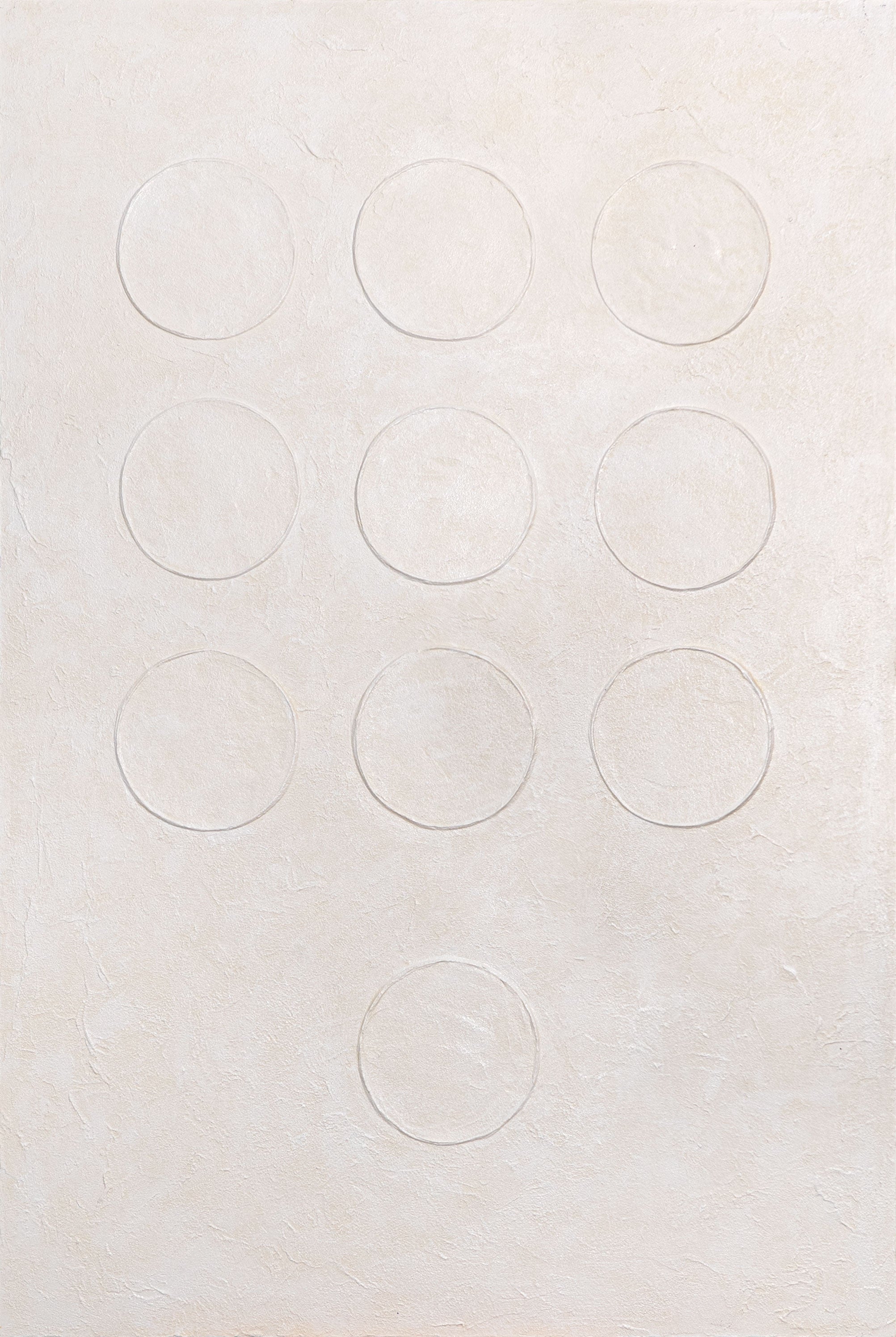 «Білий код» — це втілення тиші й чистоти. Дев’ять рельєфних кіл, вирізьблених у м’якій фактурі полотна, створюють відчуття порядку, гармонії та спокою. Світло, граючи на поверхні, змінює сприйняття об’єму, перетворюючи просту форму на медитативну композицію.
