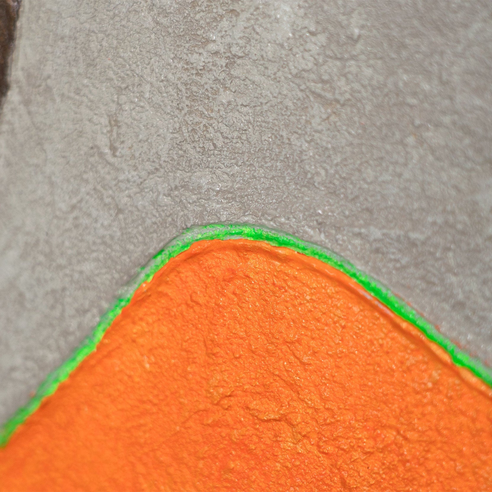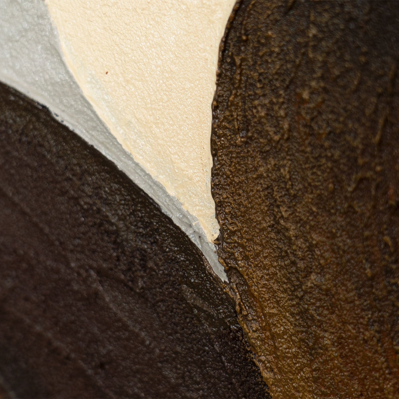 «Вечірні пагорби» — це художня інтерпретація природного рельєфу у поєднанні м’яких сірих, коричневих і насичених теракотових відтінків. Плавні лінії створюють відчуття руху та тепла, передаючи спокій заходу сонця над ландшафтом. Робота вирізняється глибокою фактурою та витонченою композицією, що поєднує геометрію й органічність.