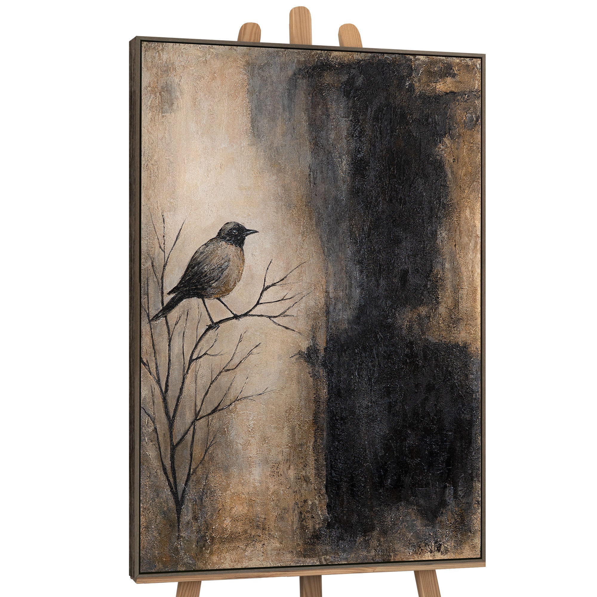 «Гілка і тінь» – це картина, що поєднує символіку природи та силу контрасту. На гілці, промальованій тонкими лініями, сидить пташка, яка виділяється на тлі глибоких чорних і теплих бежево-коричневих відтінків. Вона ніби уособлює спокій серед темряви, а текстурна поверхня полотна підсилює відчуття живості сцени та робить композицію виразною й глибокою.