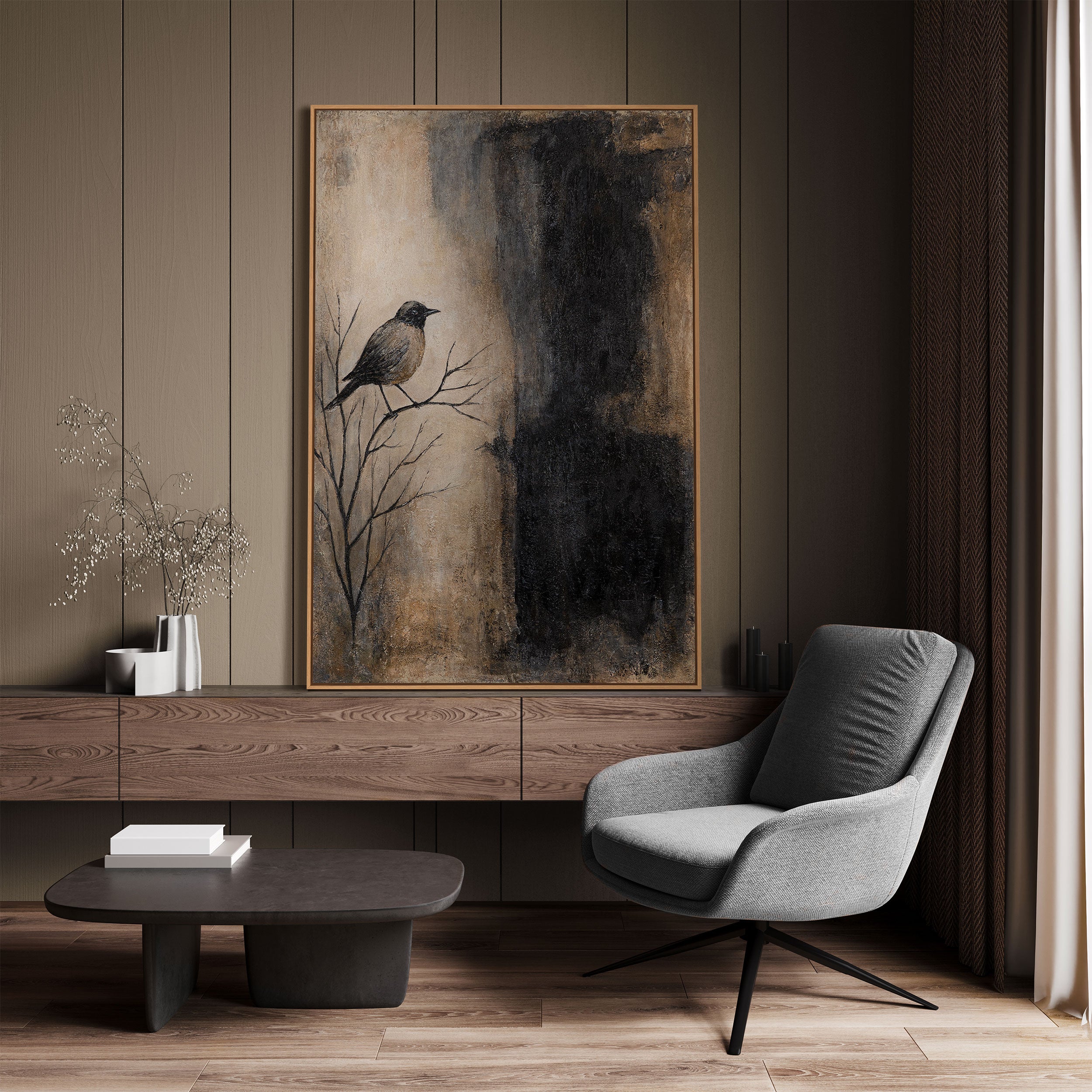 Ця робота чудово підійде для сучасного інтер’єру, додаючи атмосферності й символізму. «Гілка і тінь» створить акцент у просторі, підкреслюючи його унікальність та гармонію природних мотивів.