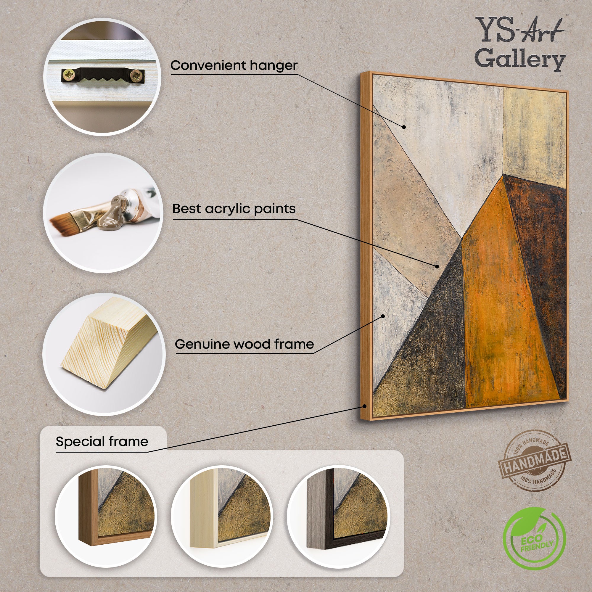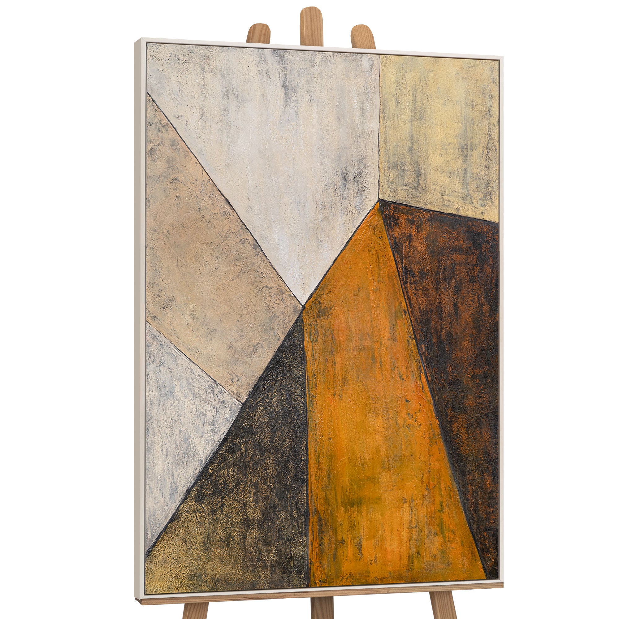 «Зустріч площин» — це діалог кольорів і форм, де м’які бежеві, чорні та насичено-помаранчеві площини перетинаються, створюючи відчуття архітектурної глибини. Структурна поверхня додає твору матеріальності, а контраст світла і тіні утворює динамічну композицію, що притягує погляд.