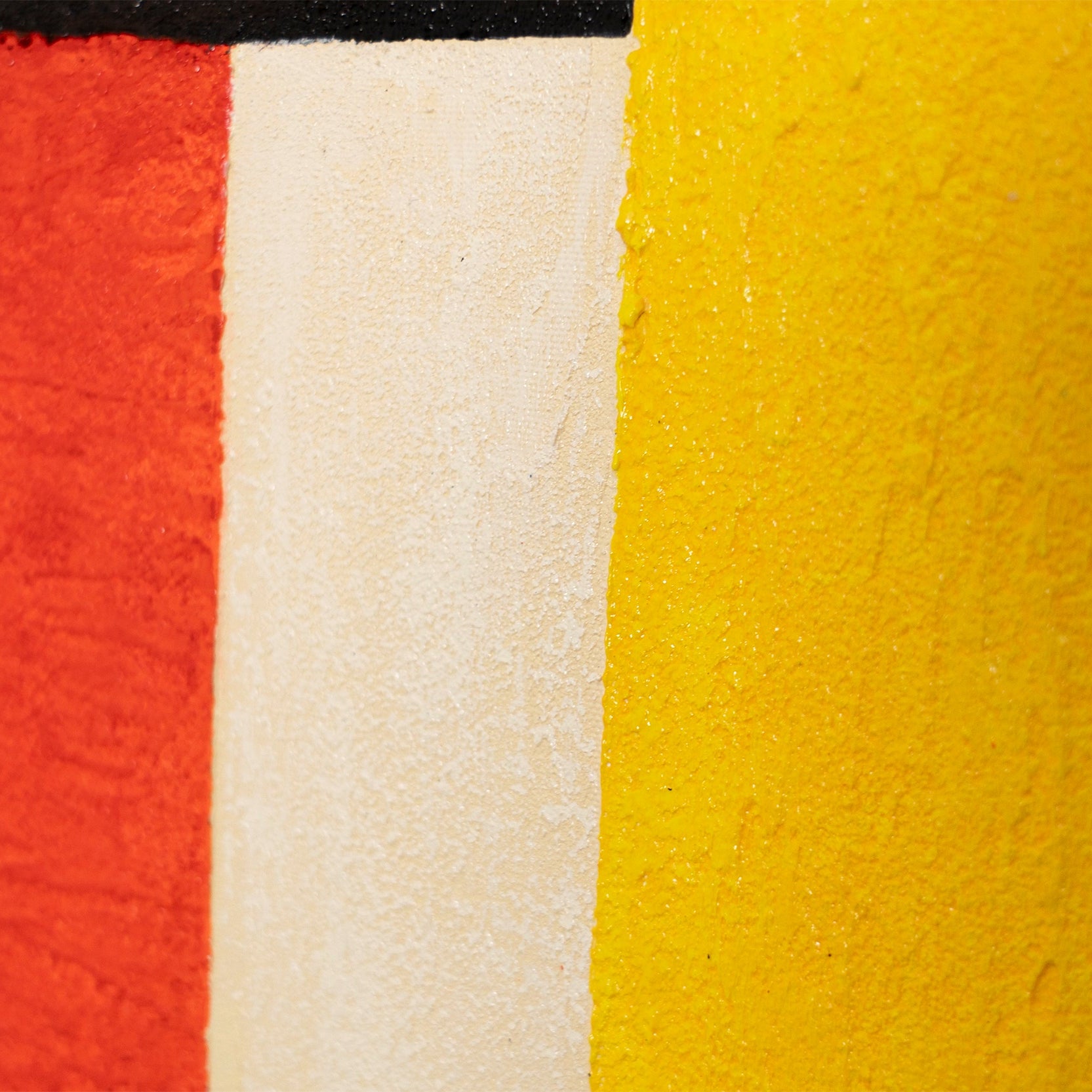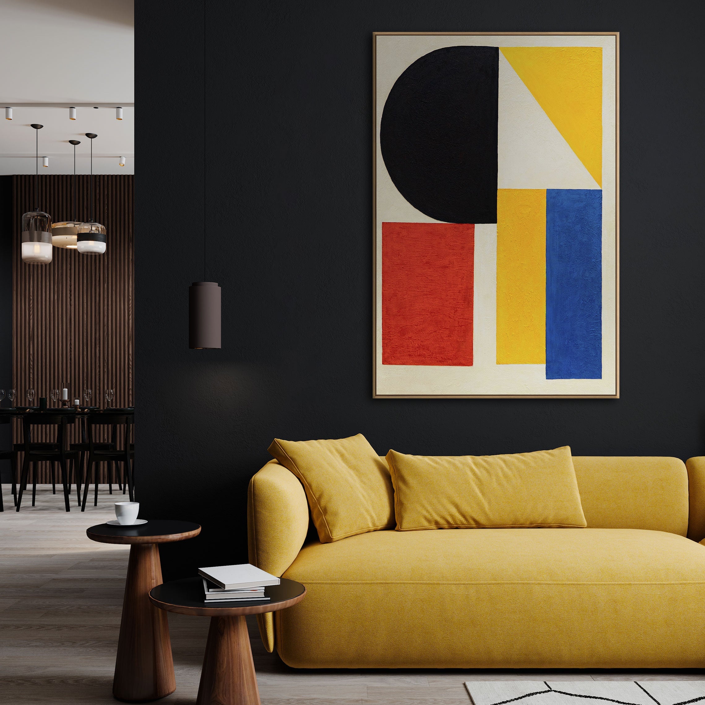 «Контрасти» — це динамічна гра кольорів і форм, де кожен елемент має власну силу. Глибокий чорний півколо врівноважує насичені площини червоного, синього та жовтого, створюючи ритм, який одночасно спокушає око й дисциплінує простір. Картина передає енергію руху та внутрішню рівновагу, закладену у простих формах.
