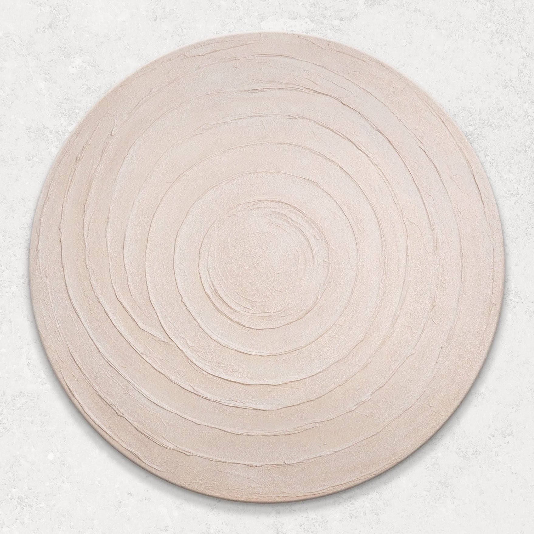 «Круговий ритм» — це спокійна гармонія форм, втілена у концентричних лініях, що створюють відчуття руху та рівноваги. М’яка фактура і світло-бежевий колір надають полотну природної легкості, ніби час розтікається по колу, залишаючи ніжний візерунок на поверхні.