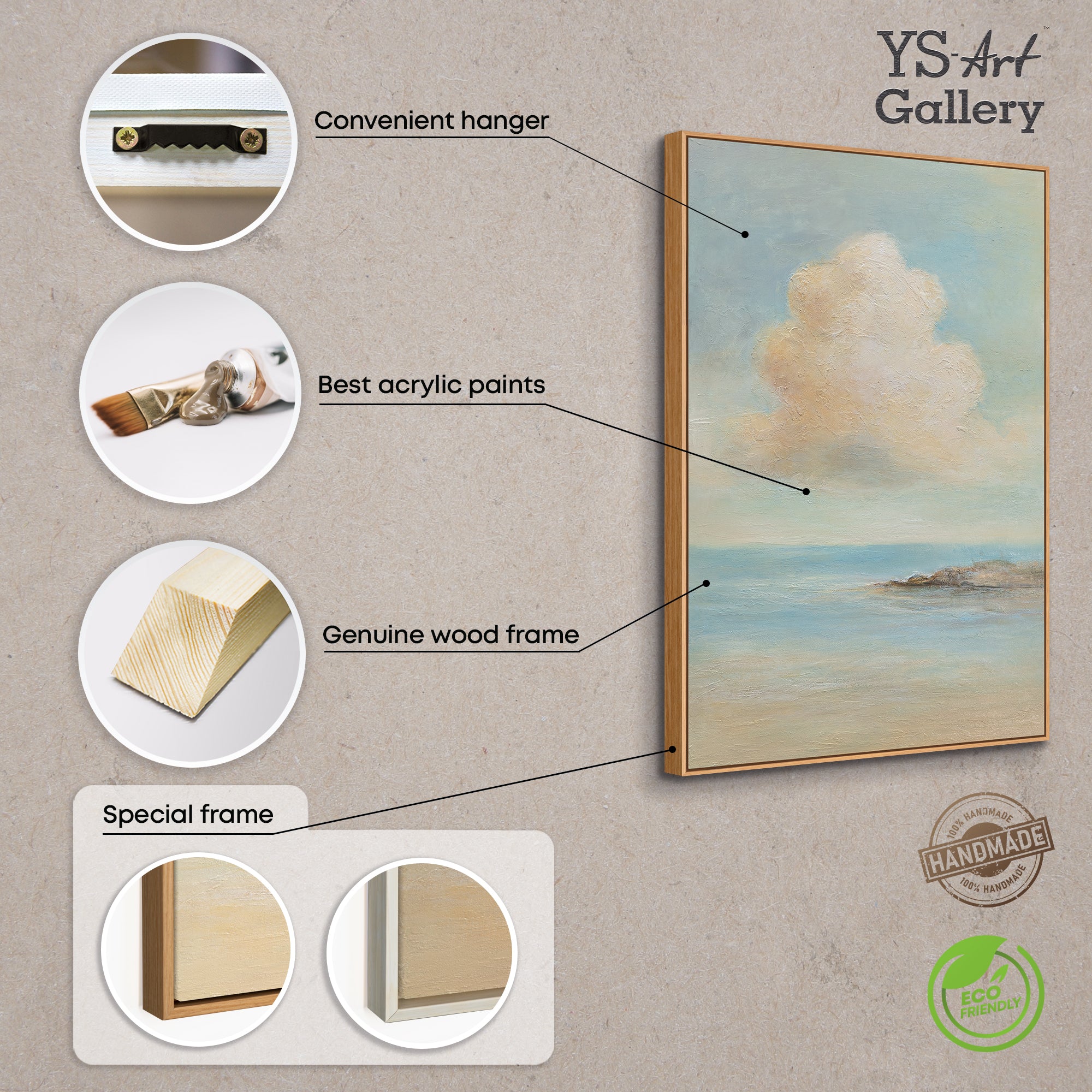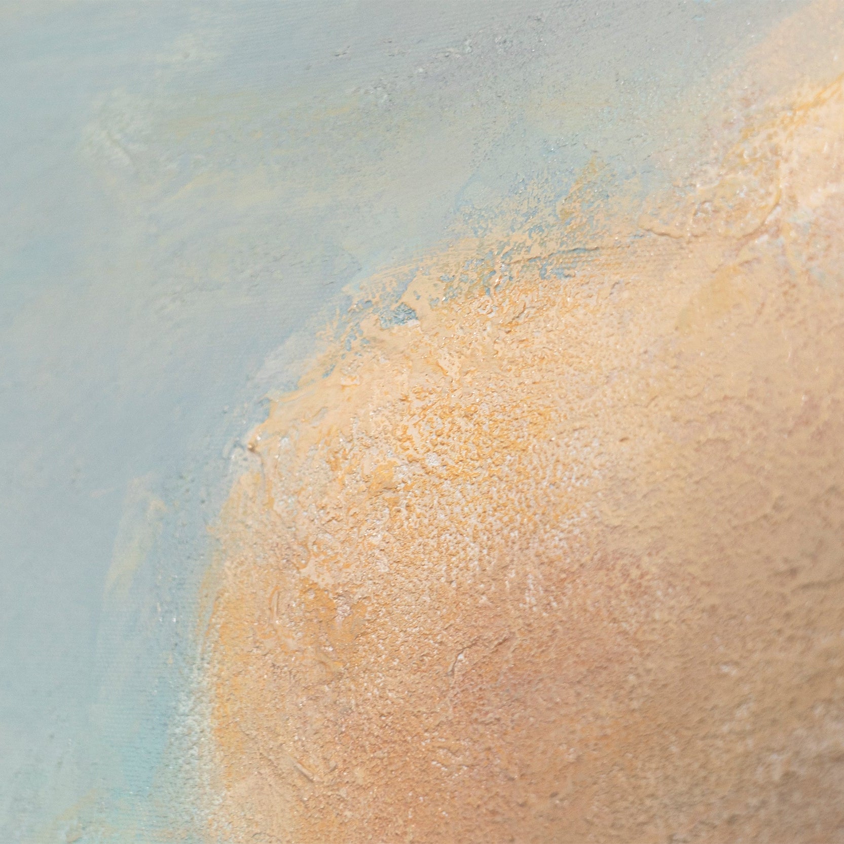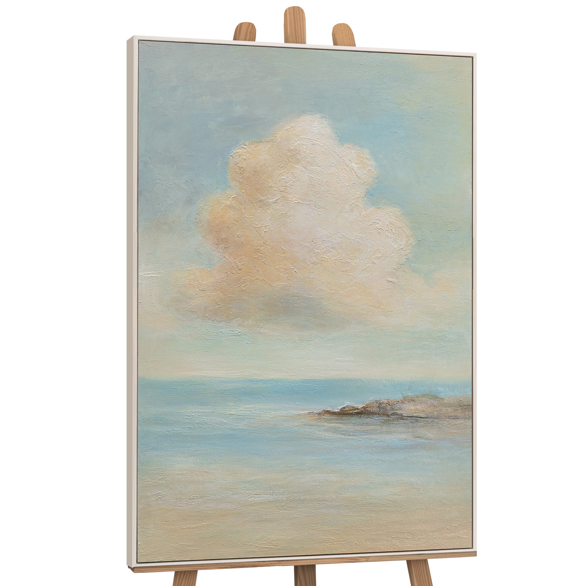 «Легкість буття» — це полотно про спокій, що народжується в тиші моря. М’які блакитні й пісочні відтінки зливаються у безмежному горизонті, де самотня хмарина пливе над спокійною водою. Текстура мазків додає глибини, створюючи відчуття живого руху світла й повітря.