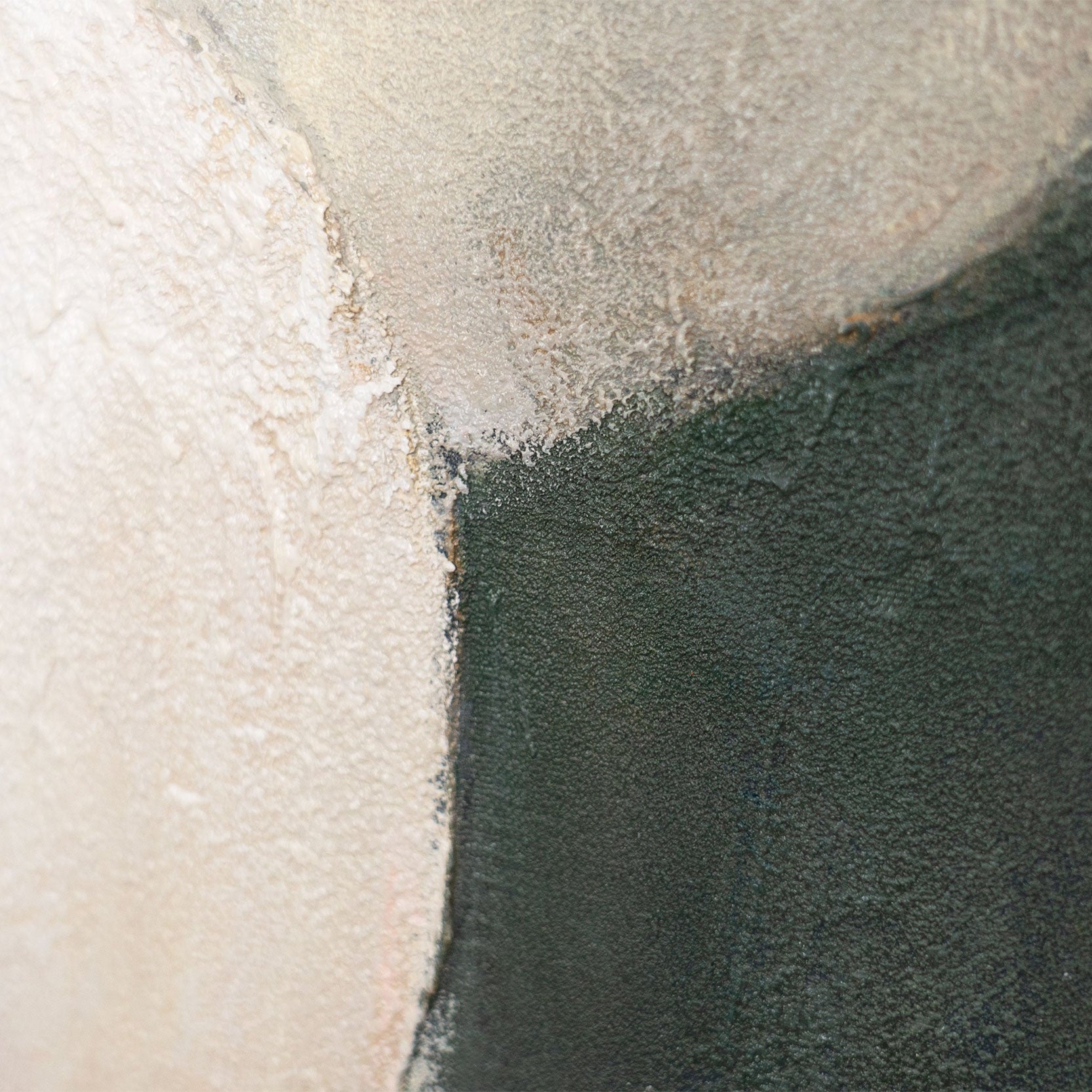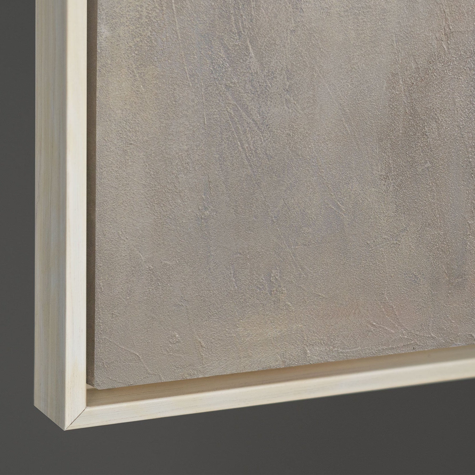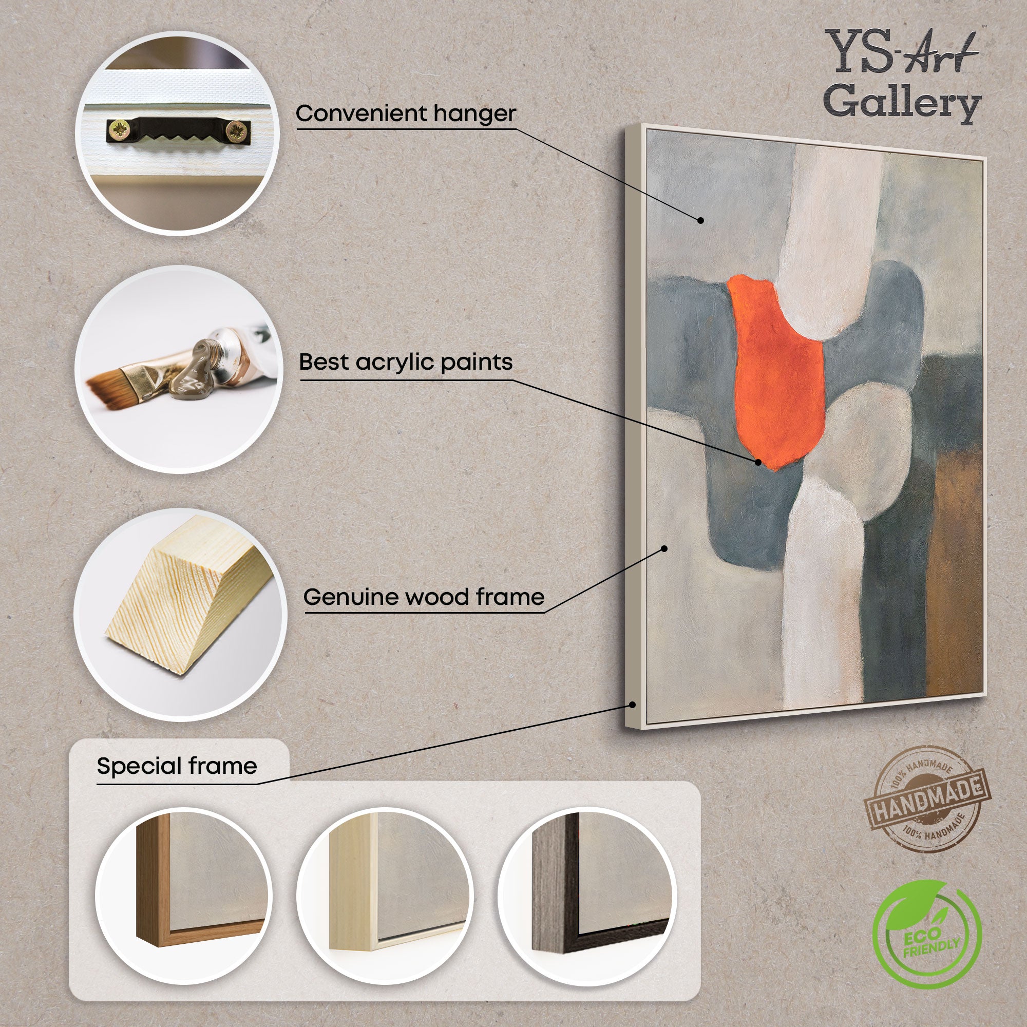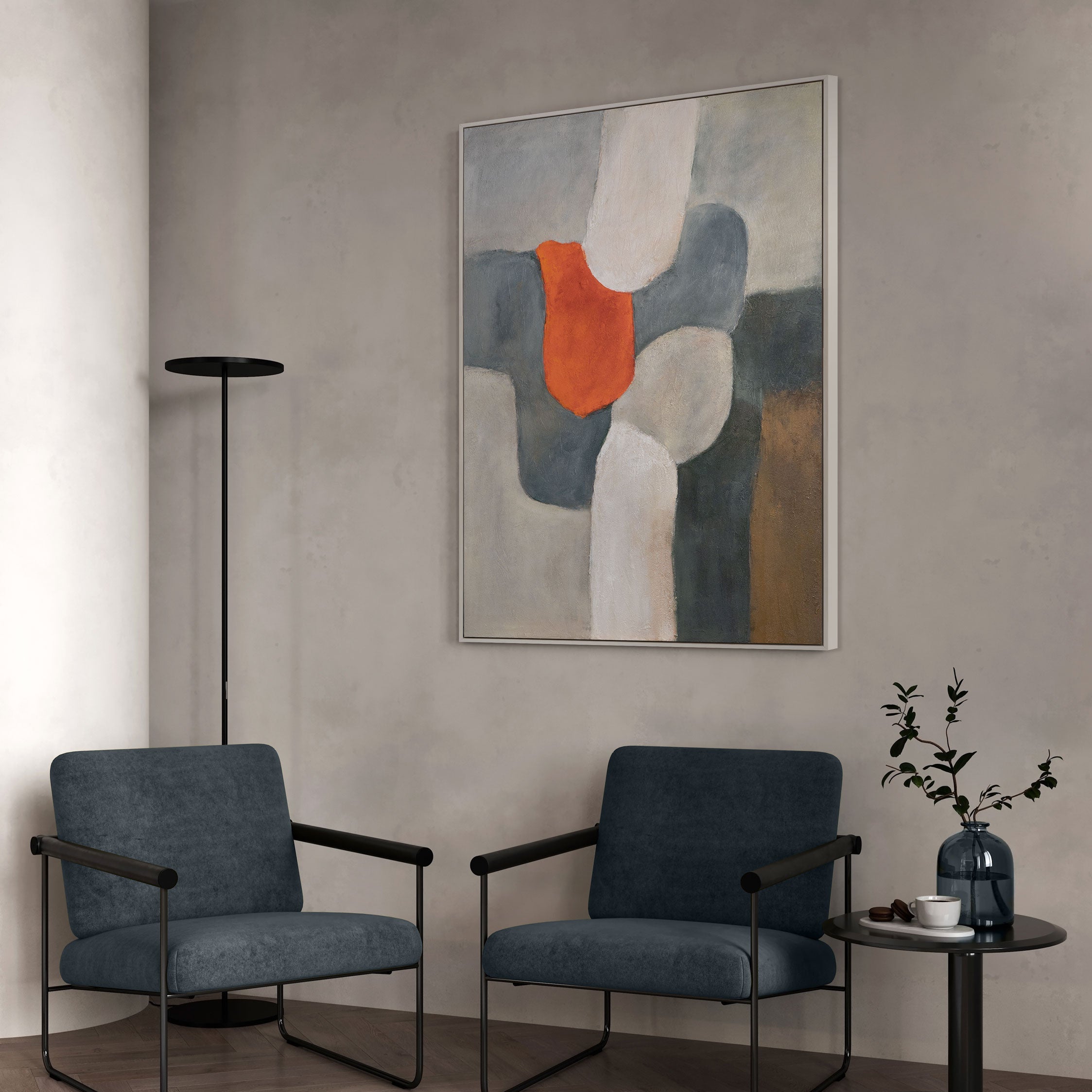 «Палаючий острів» передає внутрішню силу через поєднання м’яких сірих тонів і яскравої помаранчевої плями, що палає в центрі композиції. Динамічні переходи кольору створюють ефект руху, немов спалахи енергії серед спокійного моря відтінків. Рельєфна поверхня додає глибини та робить кожен мазок живим і відчутним.