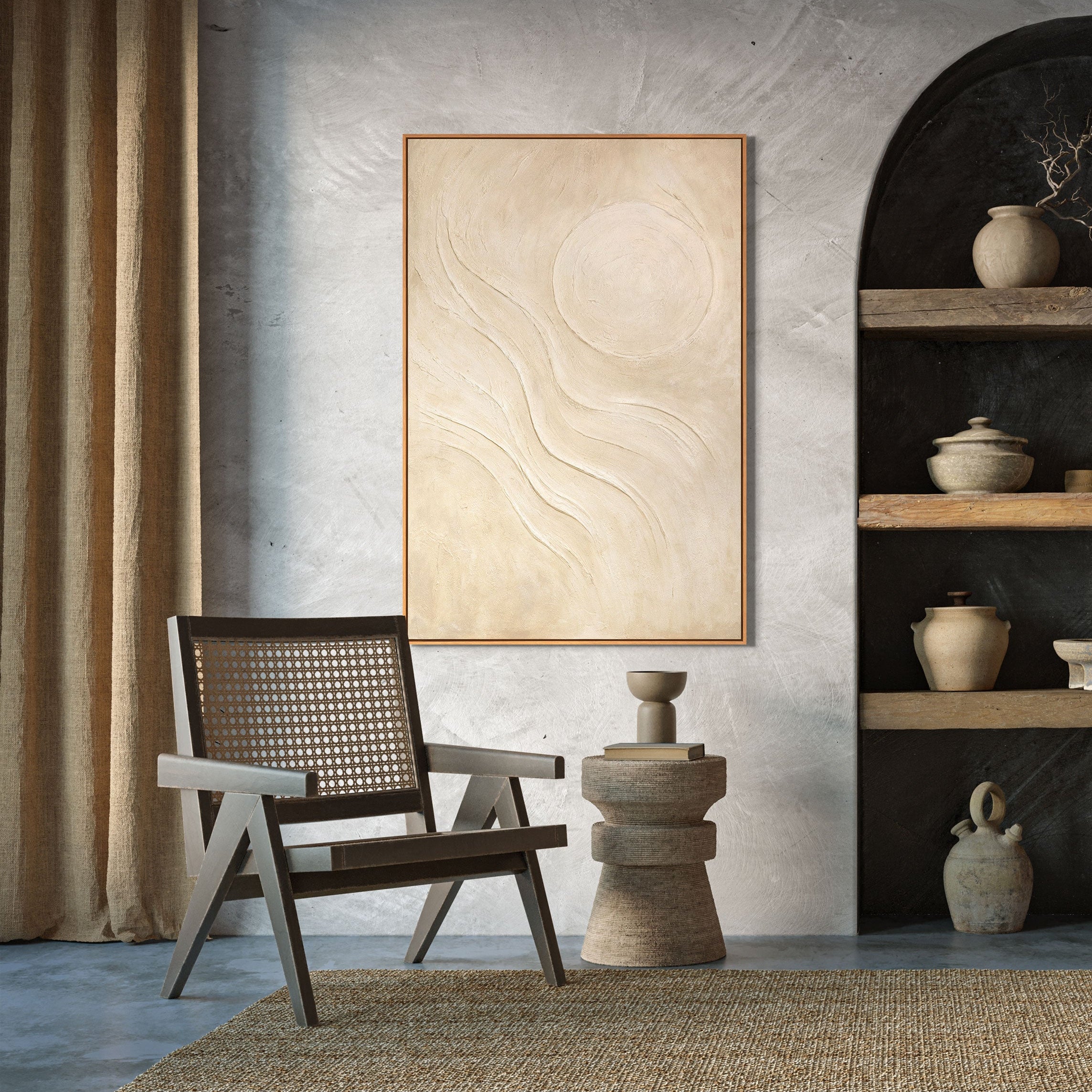 Ця робота ідеально пасує до сучасних інтер’єрів у стилі мінімалізм, скандинавський або wabi-sabi. Вона наповнює простір затишком і природним балансом, створюючи атмосферу спокою й тепла.