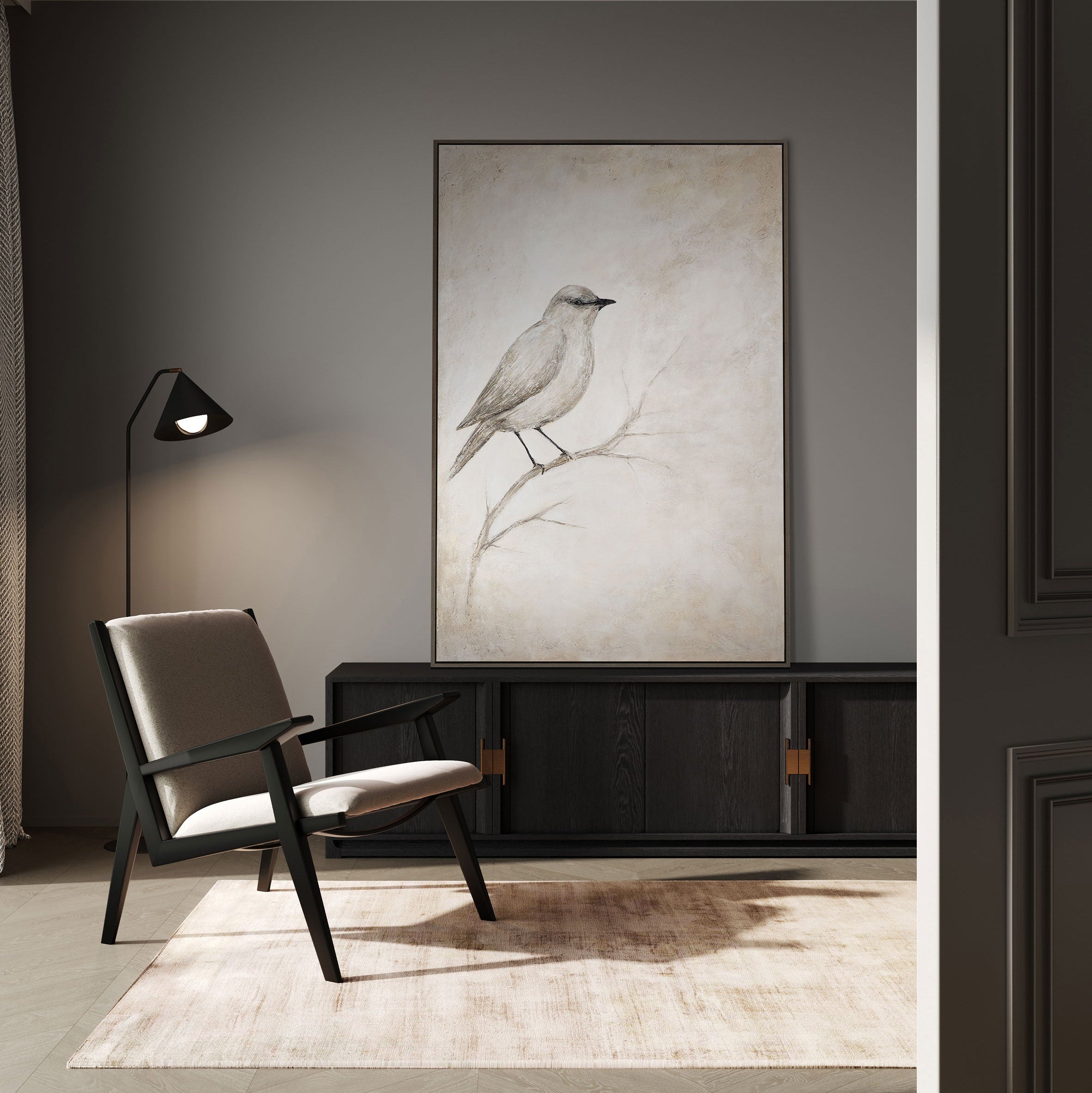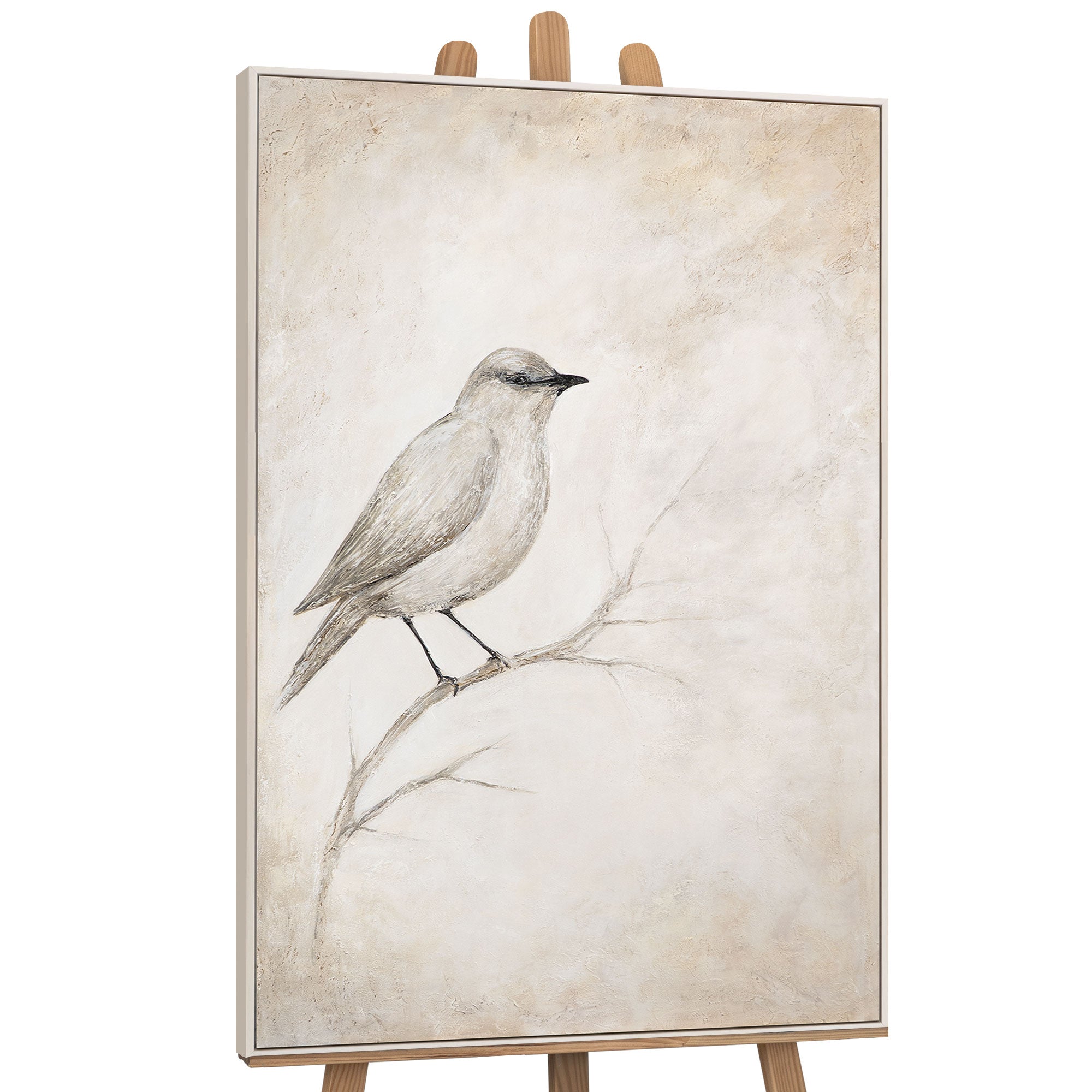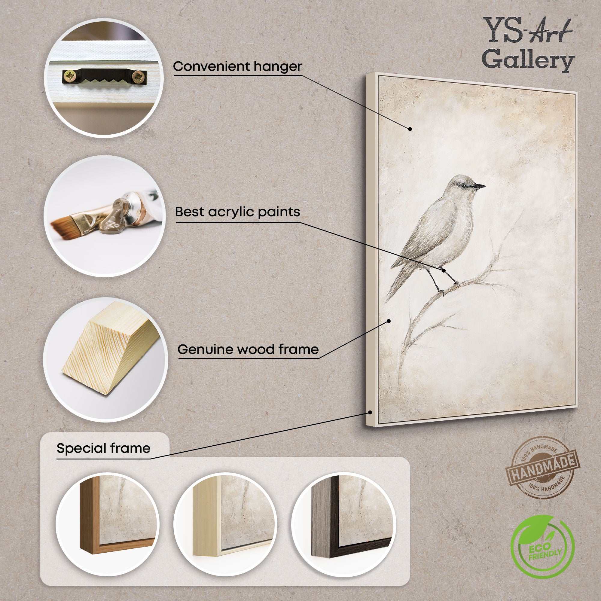 «Співоча пауза» передає момент тиші та зосередженого спокою. На гілці застиг птах, ніби слухаючи власний подих. М’які переходи кольорів і світлі бежево-сірі тони створюють атмосферу гармонії та природної легкості. Картина наповнена світлом, що додає простору відчуття повітря та тепла.