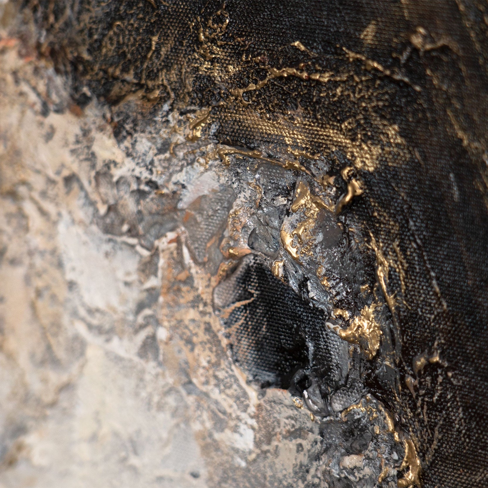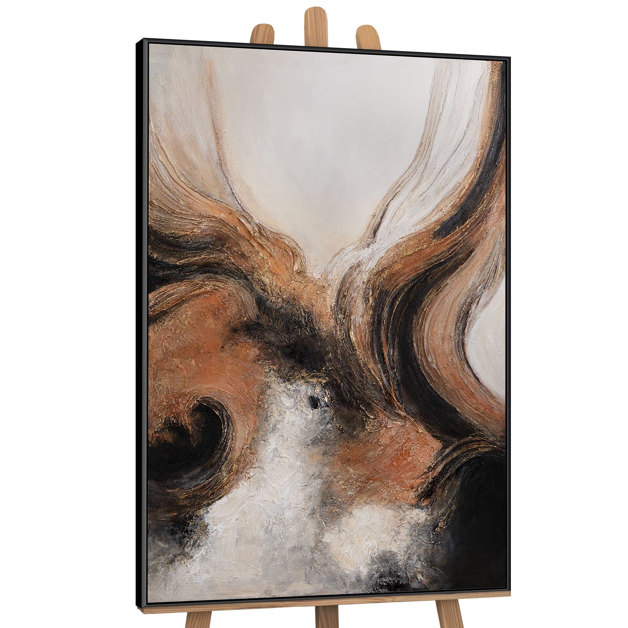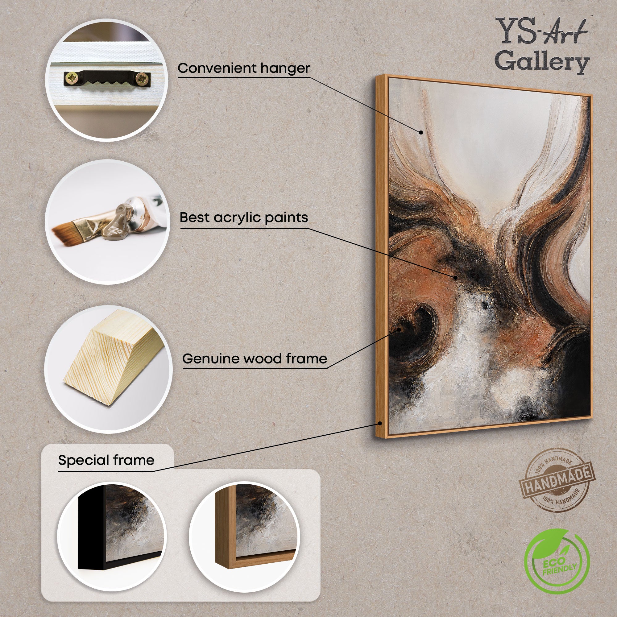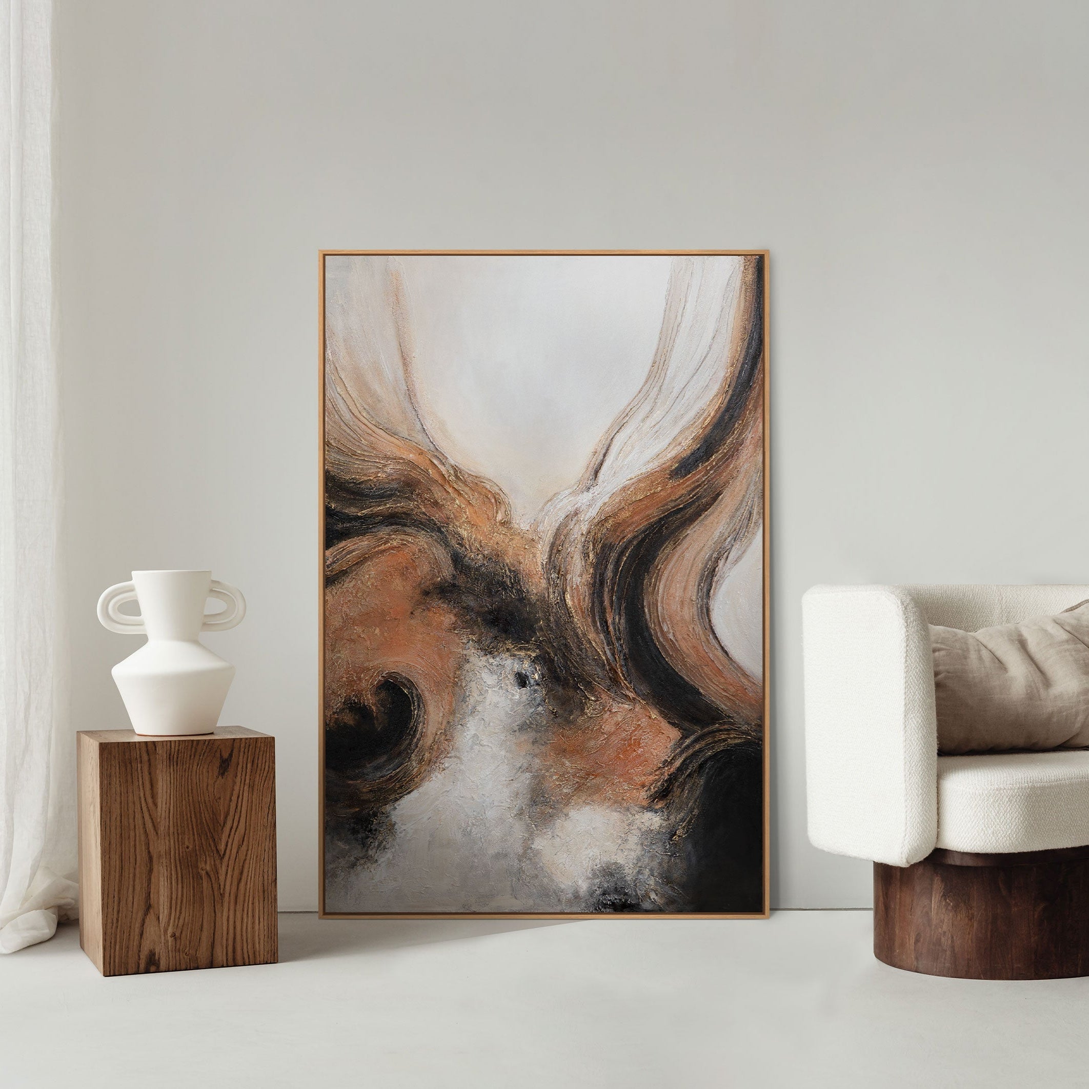 «Стихія в русі» – це абстрактна робота, де теплі відтінки охри та коричневого зливаються з глибокими чорними акцентами, створюючи відчуття руху й сили. Плавні лінії та контрастні переливи нагадують течію енергії, що виривається назовні. Текстурна поверхня підсилює виразність мазків і додає полотну глибини.