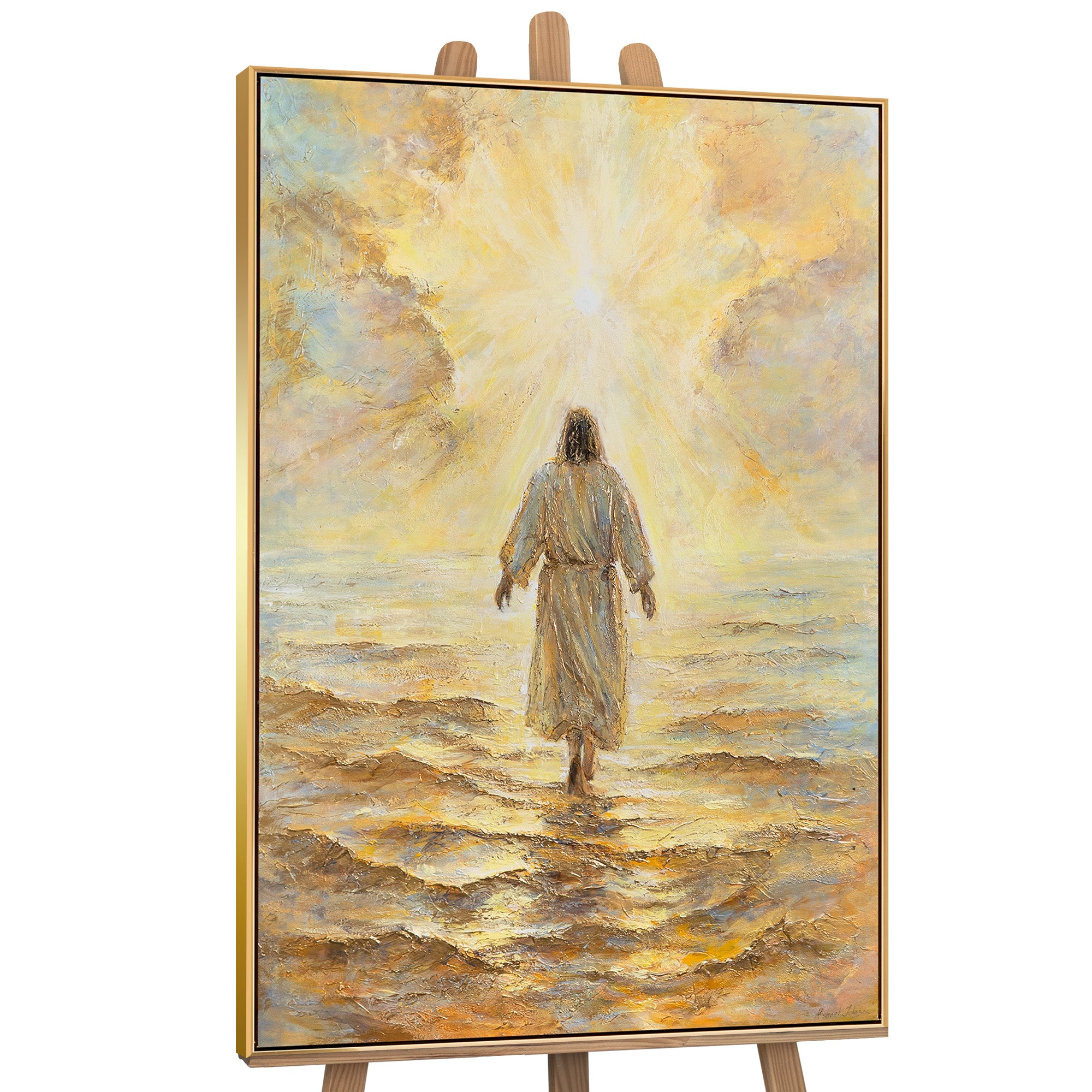 «Сяйво віри» – полотно, яке виражає ідею духовного піднесення через яскраве світло, що виходить з обрію. Ісус, що йде по воді, відображає шлях до надії, оточений гармонійним світлом. Картина витримана у ніжних пастельних відтінках, що створюють атмосферу спокою і внутрішнього спокою. Текстурована поверхня надає картині додаткову глибину та емоційність.