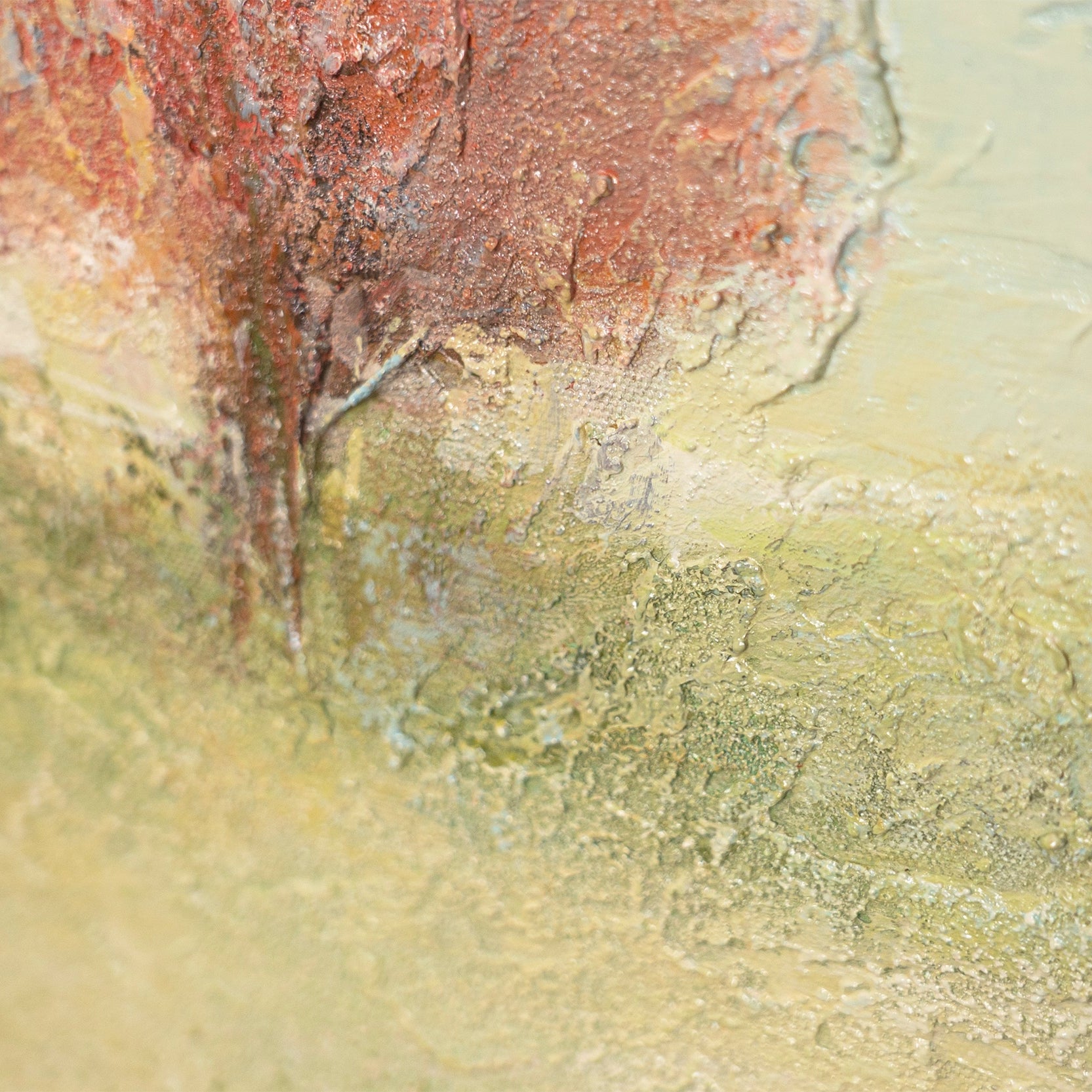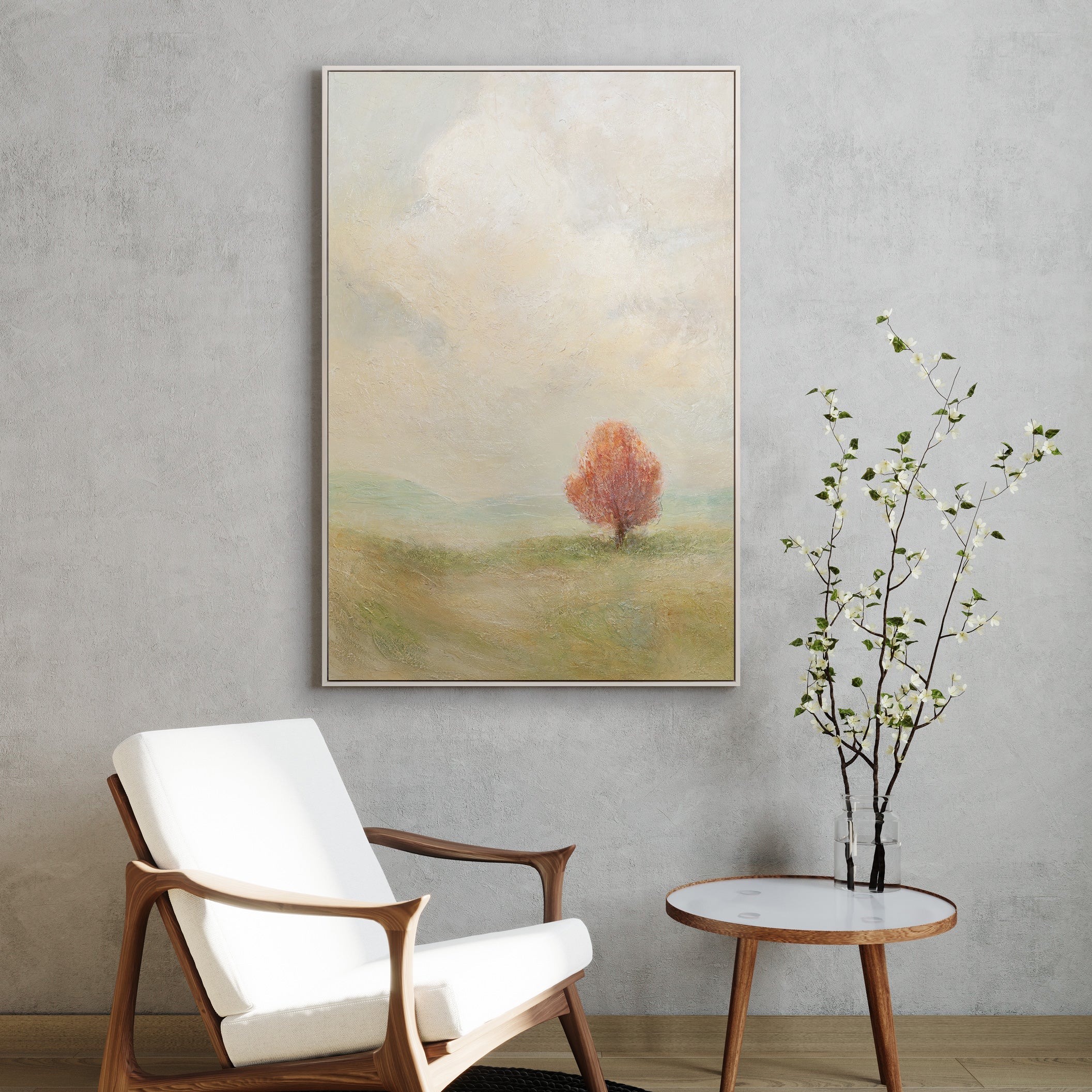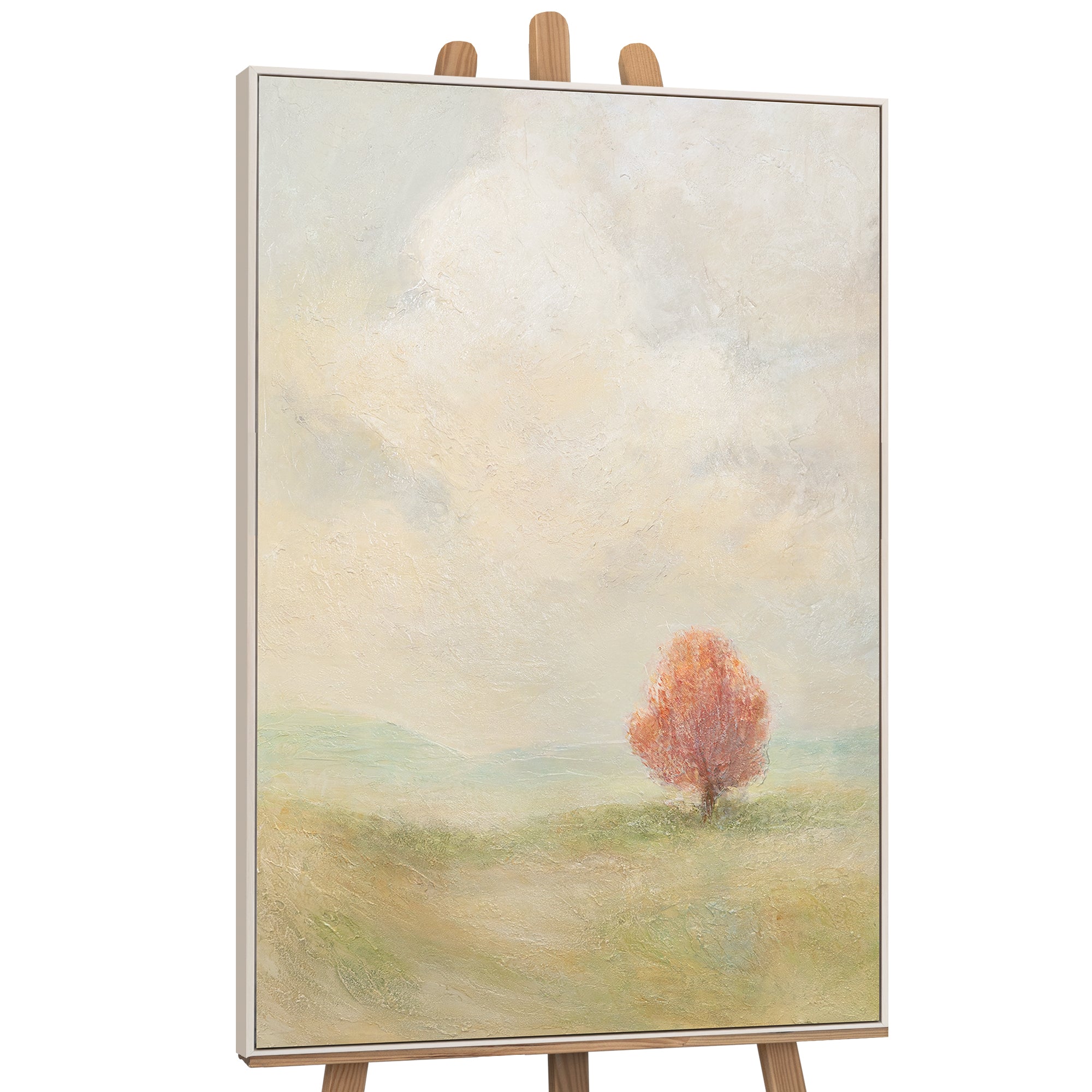 «Теплий простір» — це історія про мить тиші, коли світ здається нерухомим. На полотні зображено самотнє рожево-помаранчеве дерево, що стоїть серед ніжних зеленувато-бежевих відтінків простору. Світло м’яко розсіюється по небі, створюючи ефект внутрішнього тепла й умиротворення.