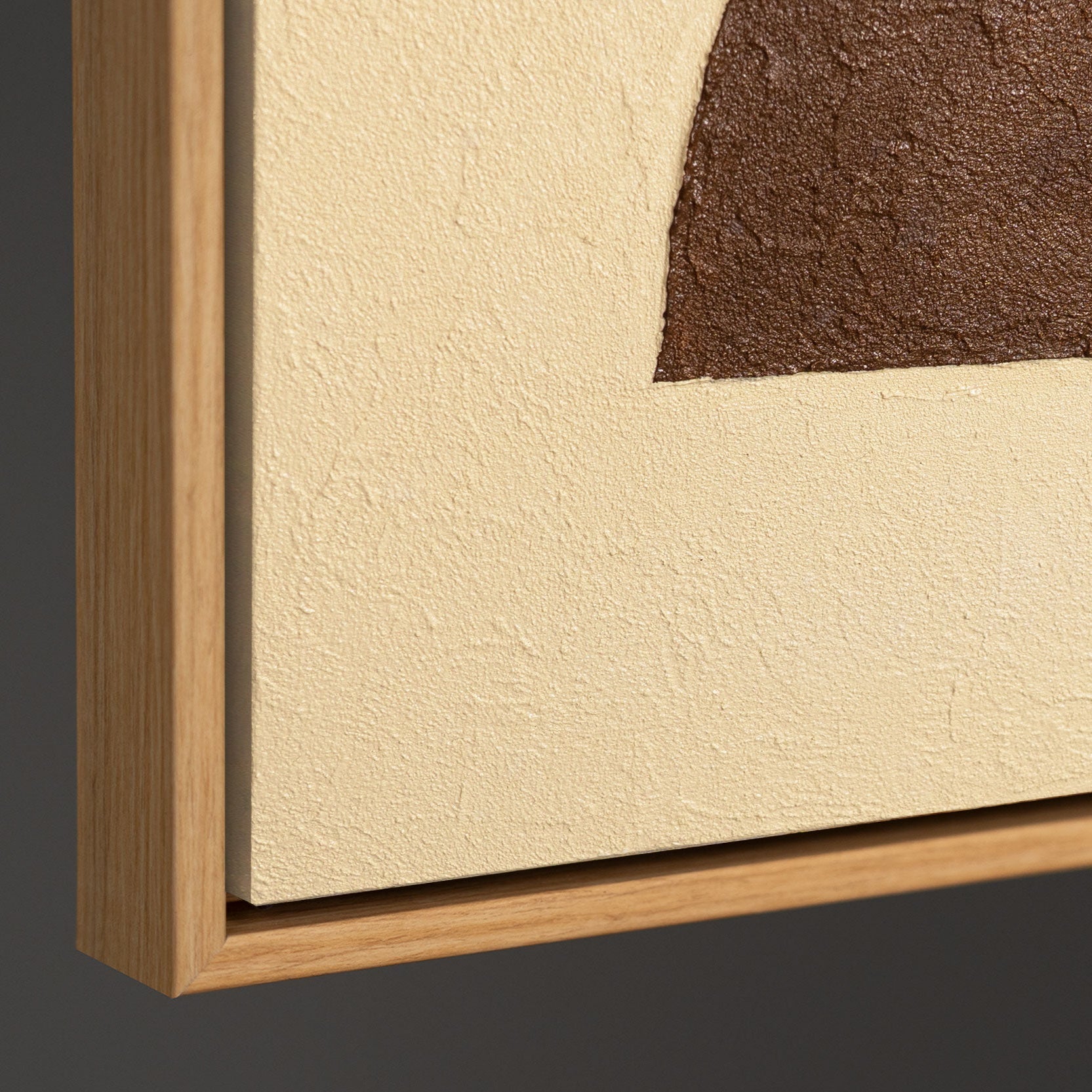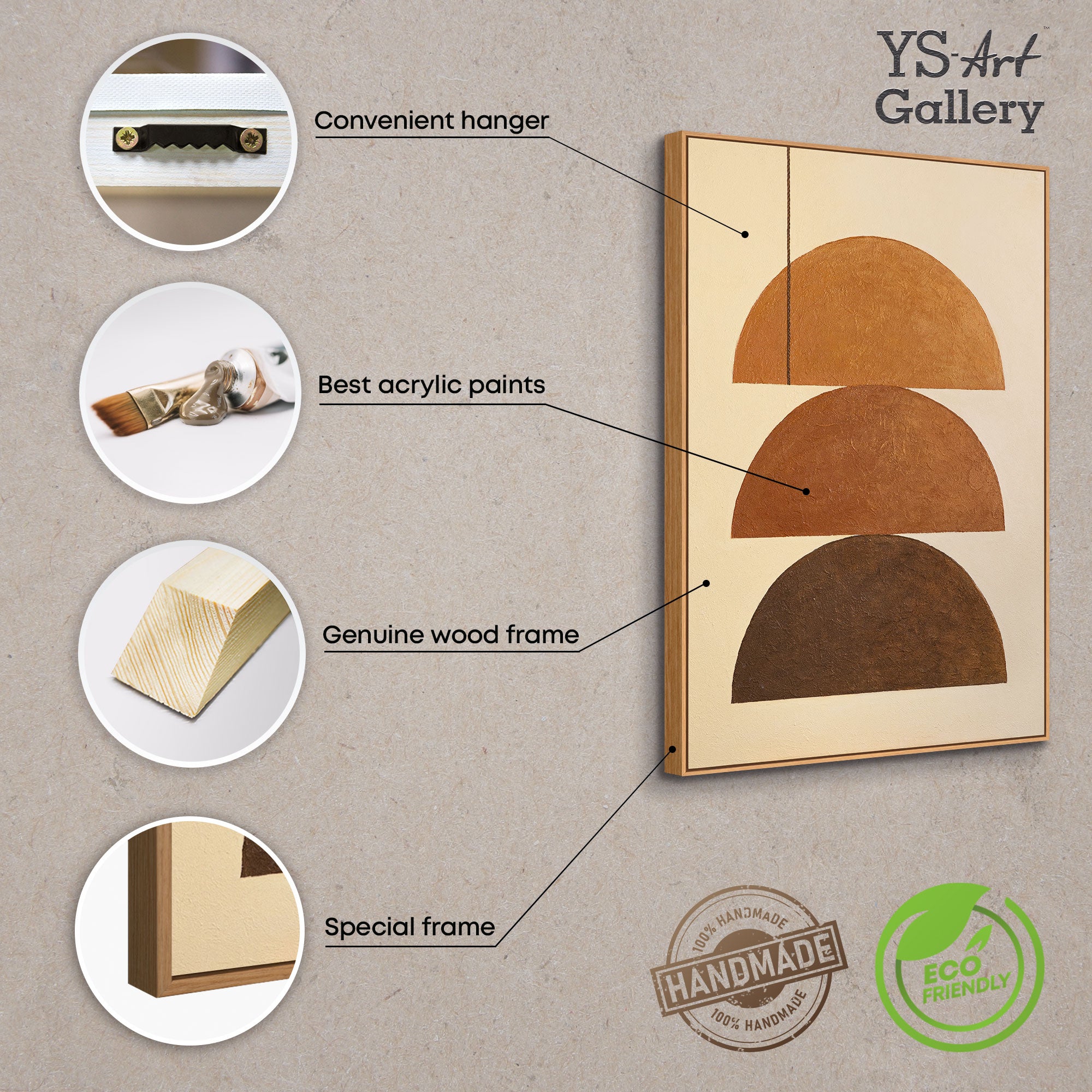 «Три горизонти» – це сучасна абстрактна композиція, побудована на простих формах і гармонії теплих кольорів. Три напівкола в золотисто-охристій гамі символізують спокій, рівновагу та поступовість руху, створюючи ефект медитативного споглядання. Лаконічність сюжету та текстурна поверхня додають твору виразності й сучасного характеру.